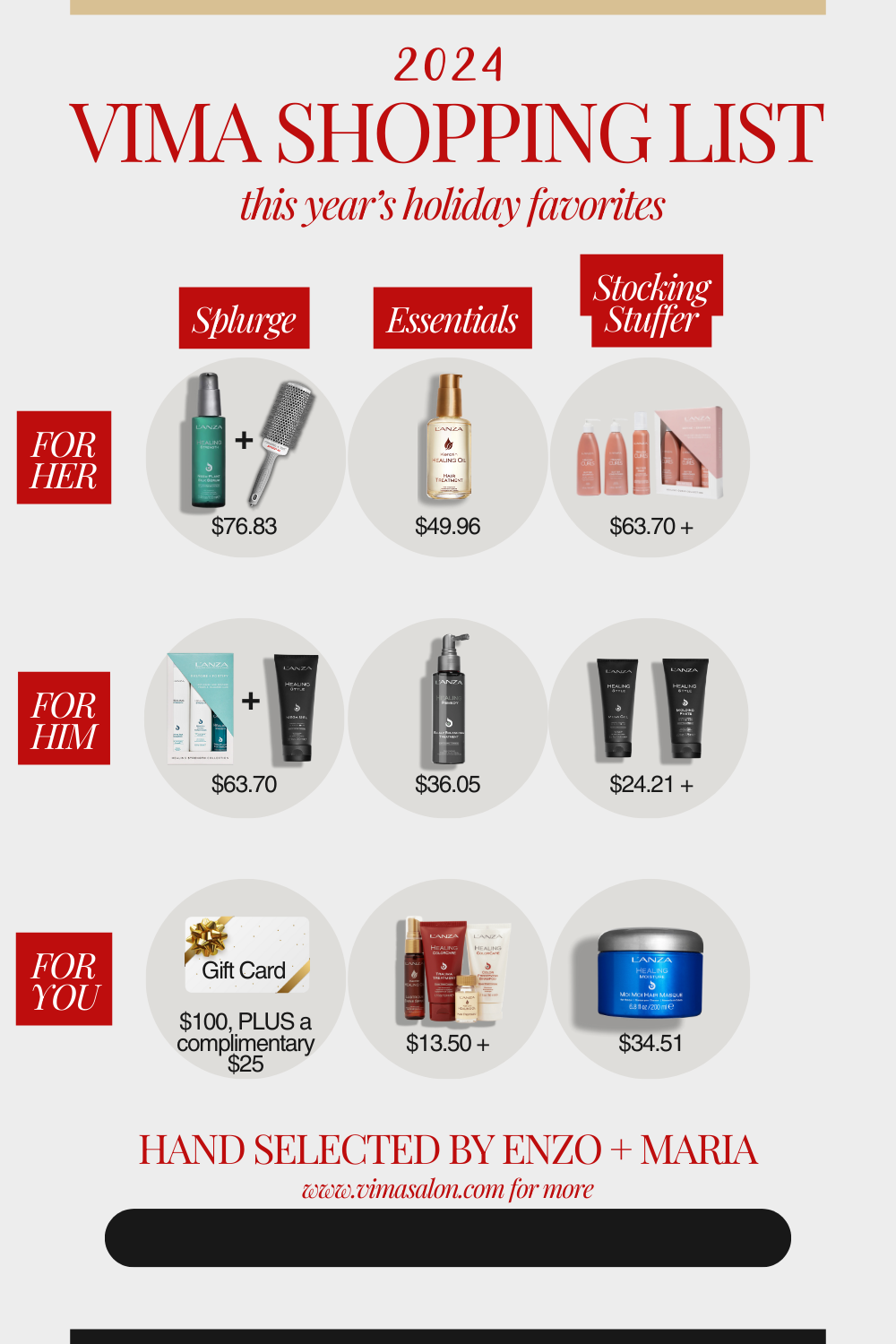 You probably know by now that we’re team “mini gifts > candy” in our stockings at VIMA SALON, so that brings us to Enzo’s recommendation for stocking stuffers for the fellas in your life! Gift any of our L’ANZA Mega Gel or Molding Paste so he can style his hair on his own at home! Does he need a tutorial on doing this? Book a men’s haircut or hair treatment with Enzo, Maria, or Massimo so they can give step by step in-person styling tips to perfect their hair at no extra charge!